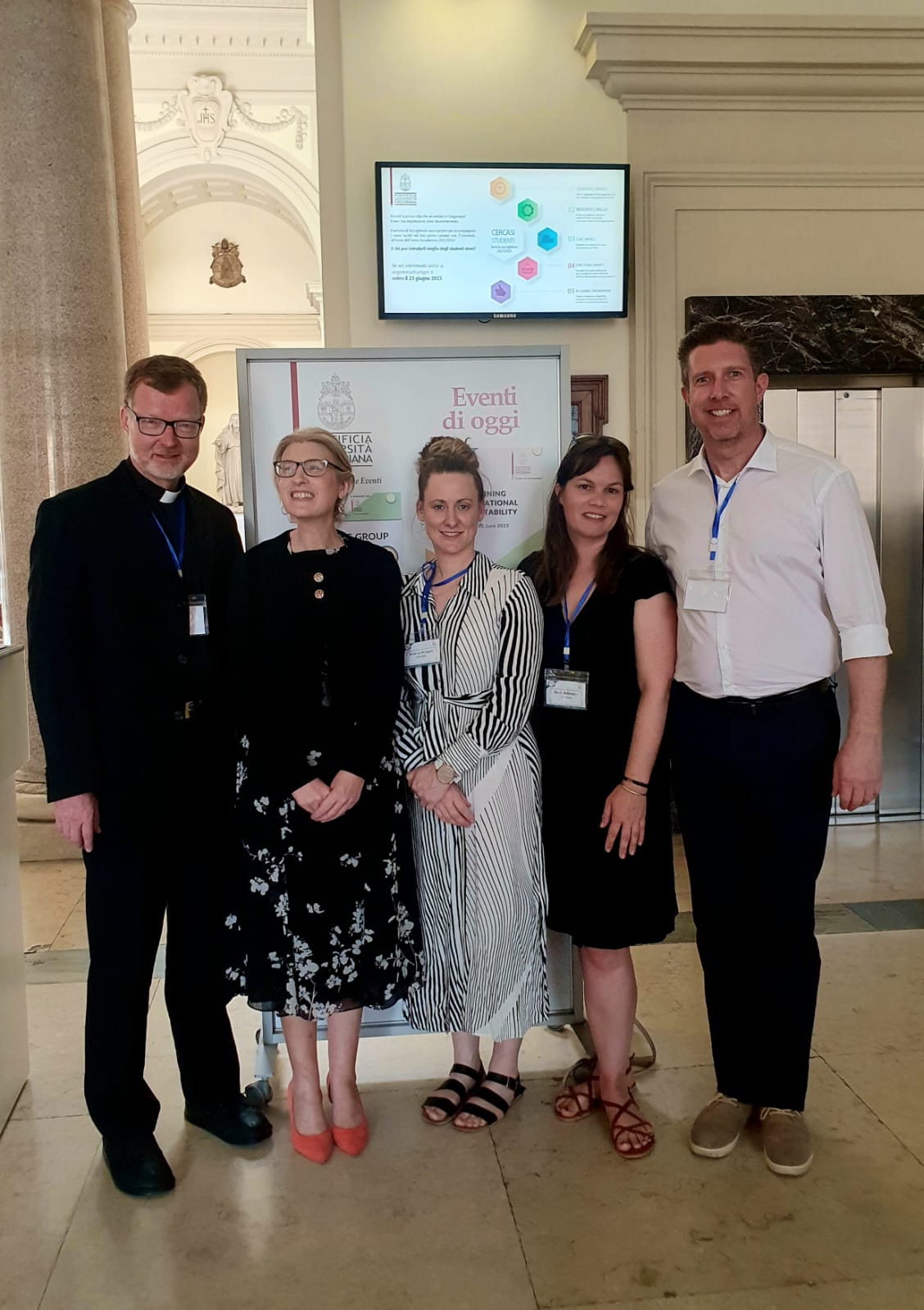 Naidi is pictured with Valerie Philpott, Misean Cara Safeguarding Adviser, Ambassador Frances Collins, Embassy of Ireland to the Holy See, Fr. Hans Zollner SJ, Director of the Institute of Anthropology, Pontifical Gregorian University and Simon Davies, Director of Professional Standards, Jesuits, Australia.